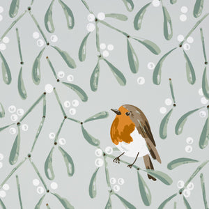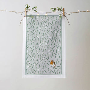 Perfect for a minimalist Christmas, the Mistletoe & Robin Tea Towel pictures a jolly red robin on a soft sage green background that is scattered with branches of mistletoe and white berries.